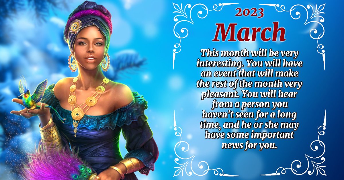 This month will be very interesting. You will have an event that will make the rest of the month very pleasant. You will hear from a person you haven't seen for a long time, and he or she may have some important news for you.