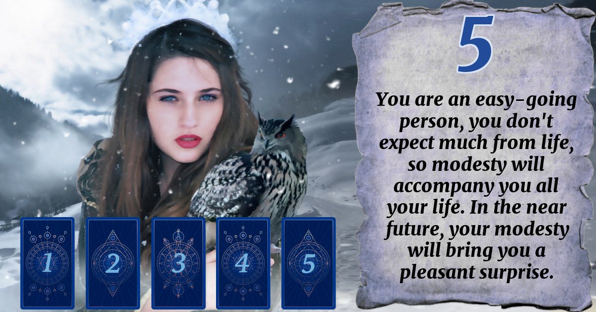 You are an easy-going person, you don't expect much from life, so modesty will accompany you all your life. In the near future, your modesty will bring you a pleasant surprise.