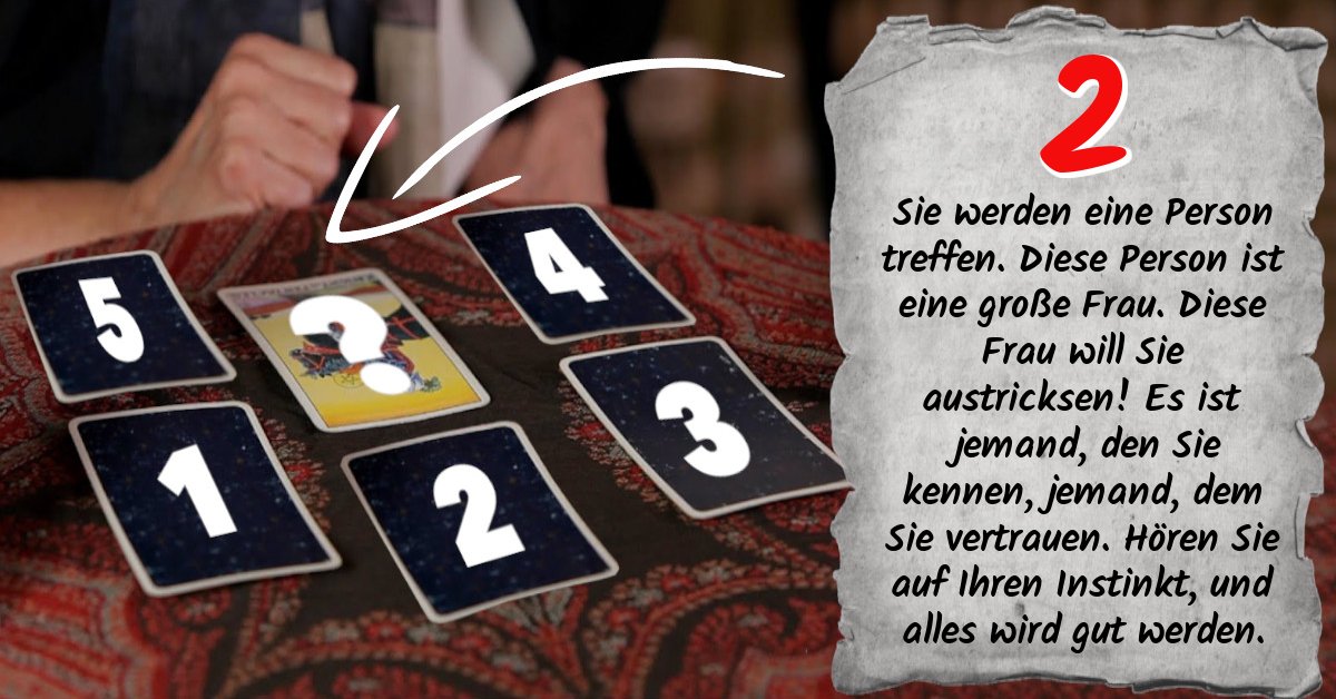 Sie werden eine Person treffen. Diese Person ist eine große Frau. Diese Frau will Sie austricksen! Es ist jemand, den Sie kennen, jemand, dem Sie vertrauen. Hören Sie auf Ihren Instinkt, und alles wird gut werden.