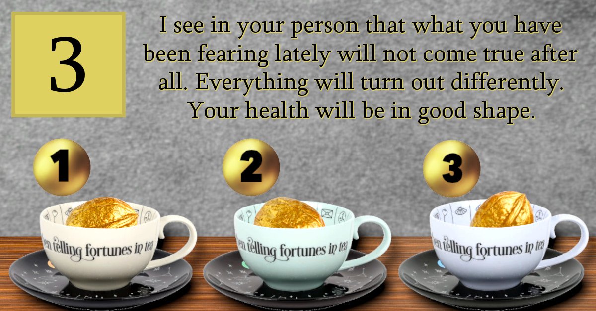 I see in your person that what you have been fearing lately will not come true after all. Everything will turn out differently. Your health will be in good shape.