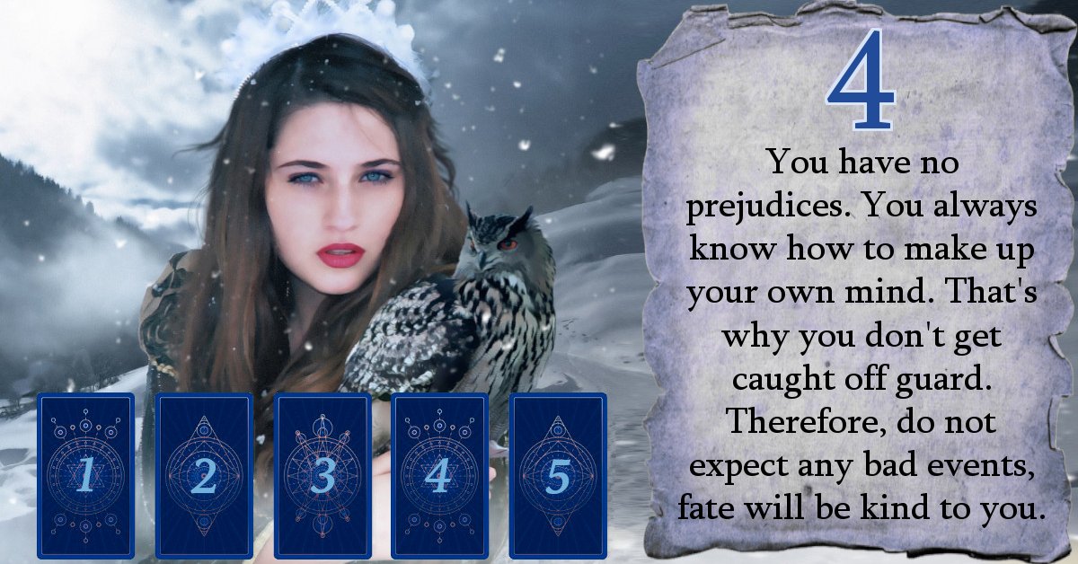 You have no prejudices. You always know how to make up your own mind. That's why you don't get caught off guard. Therefore, do not expect any bad events, fate will be kind to you.