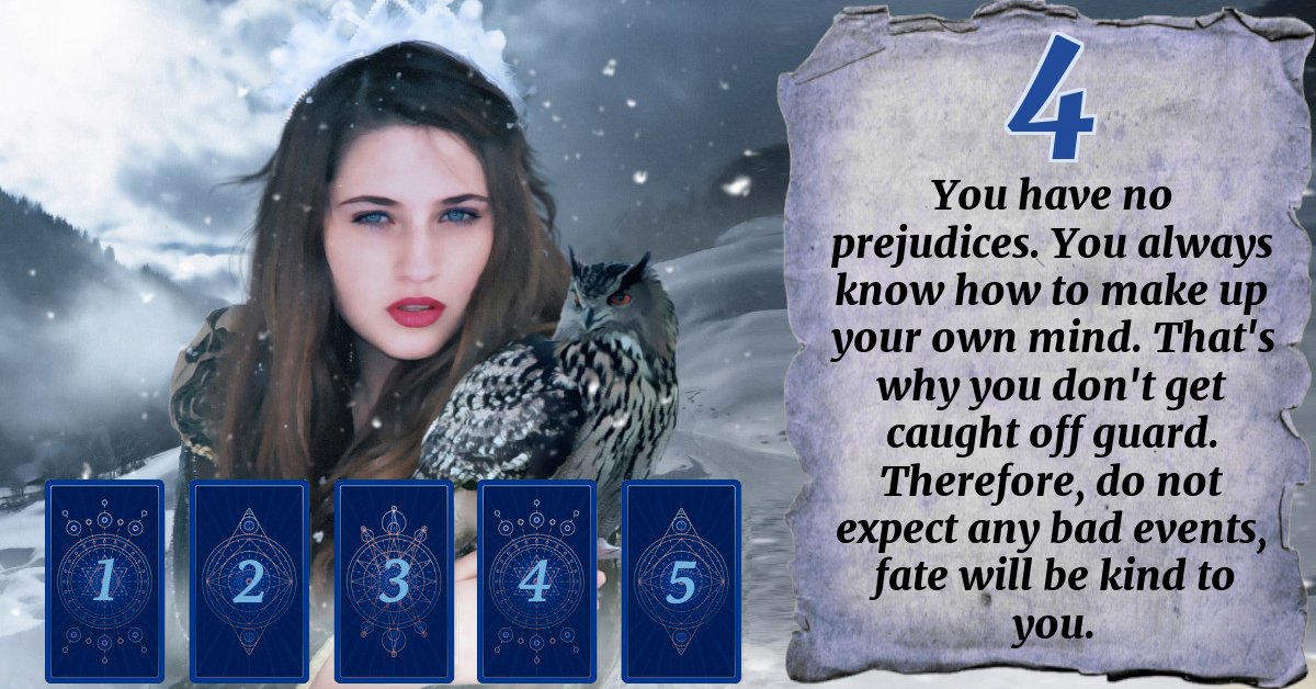 You have no prejudices. You always know how to make up your own mind. That's why you don't get caught off guard. Therefore, do not expect any bad events, fate will be kind to you.