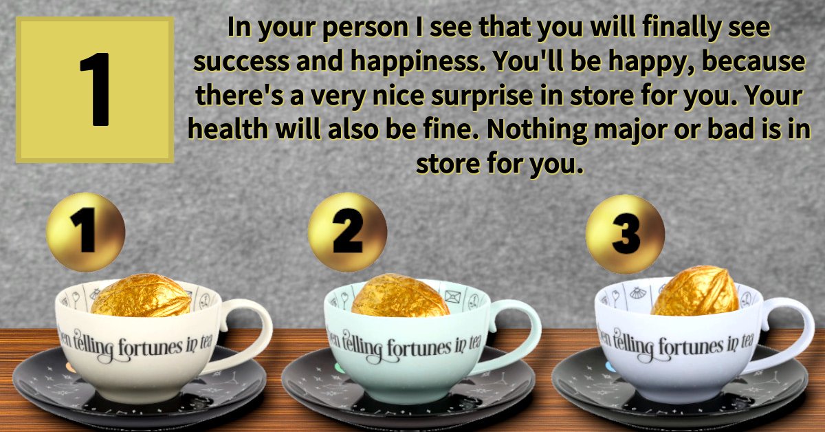 In your person I see that you will finally see success and happiness. You'll be happy, because there's a very nice surprise in store for you. Your health will also be fine. Nothing major or bad is in store for you.